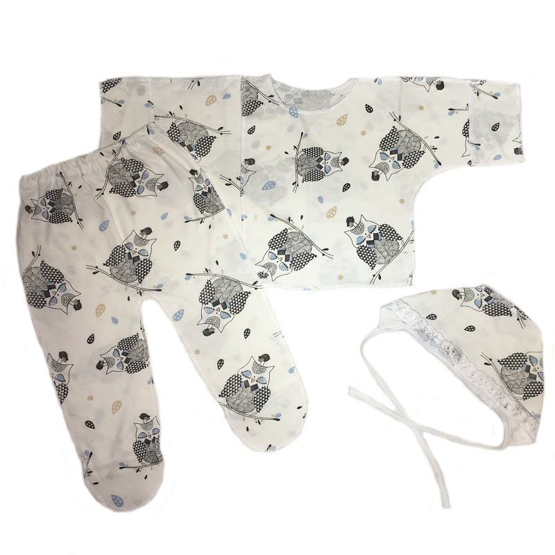Комплект состоит из распашонки с рукавчиками трансформерами и с кнопочкой на одной стороне, ползунков на резинке, чепчика. Все швы у набора выполнены наружу. Рисунки в каждой партии отличаются.